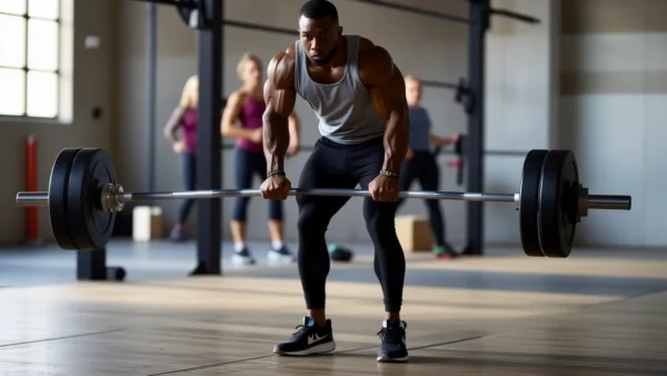 Un hombre atlético levanta pesas en un gimnasio